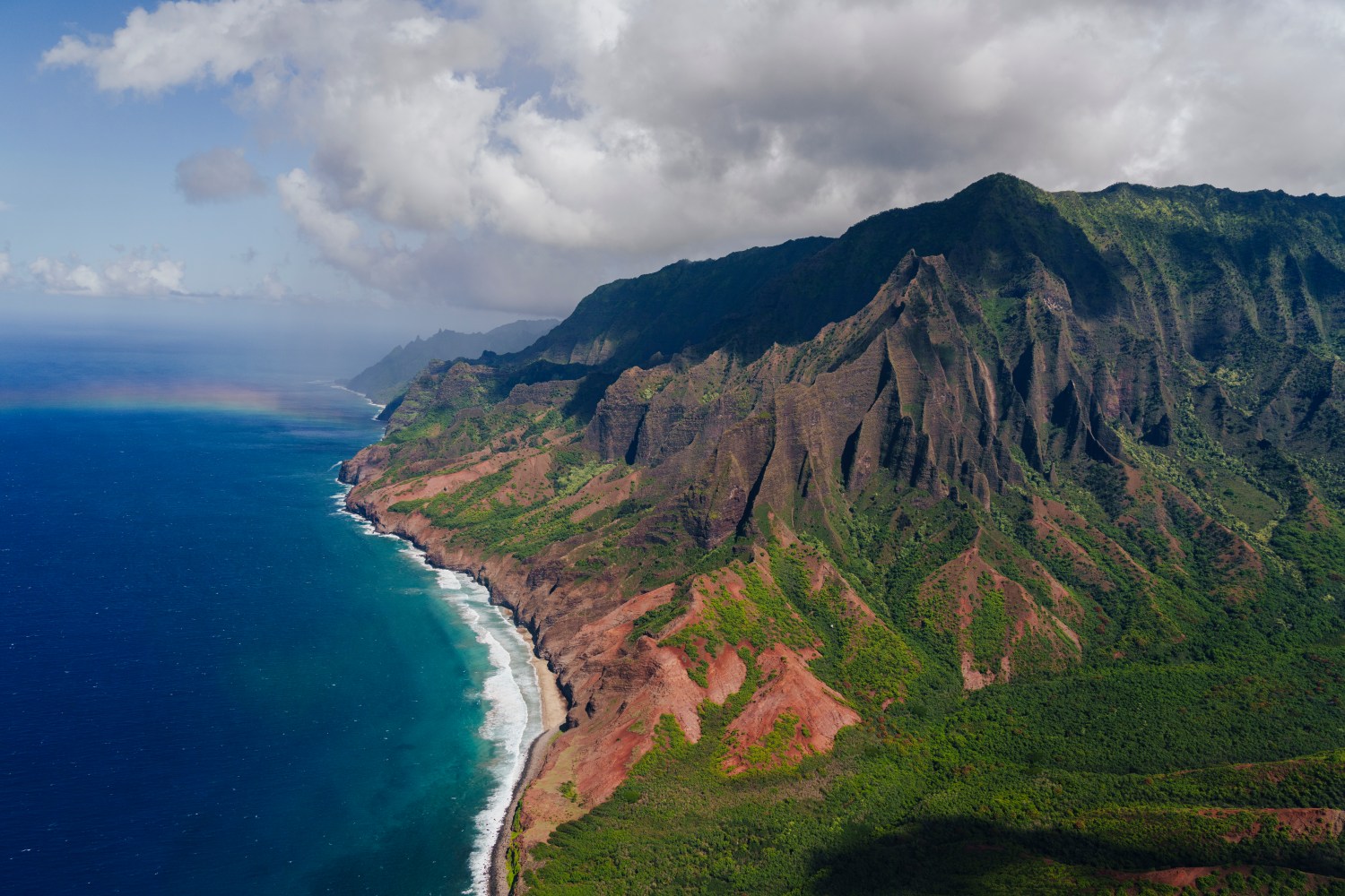 The Nā Pali Coast is the island’s icon, but the full drama, 3,500-ft cliffs, razor ridges, and cathedral-like valleys, only makes sense from above. Look for Honopū’s natural arch, the sinuous folds of Kalalau Valley, and surf exploding against buttressed green walls.